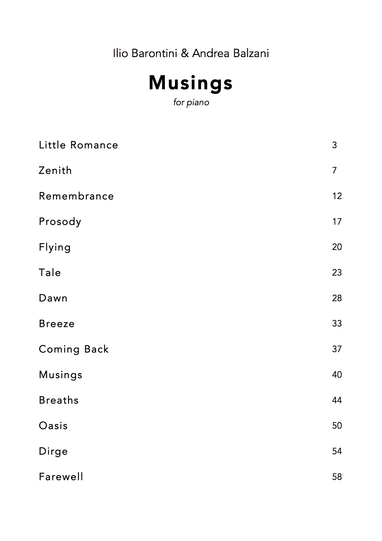 Musings is a collection of 14 pieces for piano, composed by Ilio Barontini & Andrea Balzani. This work is a sort of continuation of the synergy between Balzani's musical ideas and the perfected piano composing offered to them by Maestro Ilio Barontini. The story of their collaboration began with the 24 pieces of Experience (see details about Experience here).